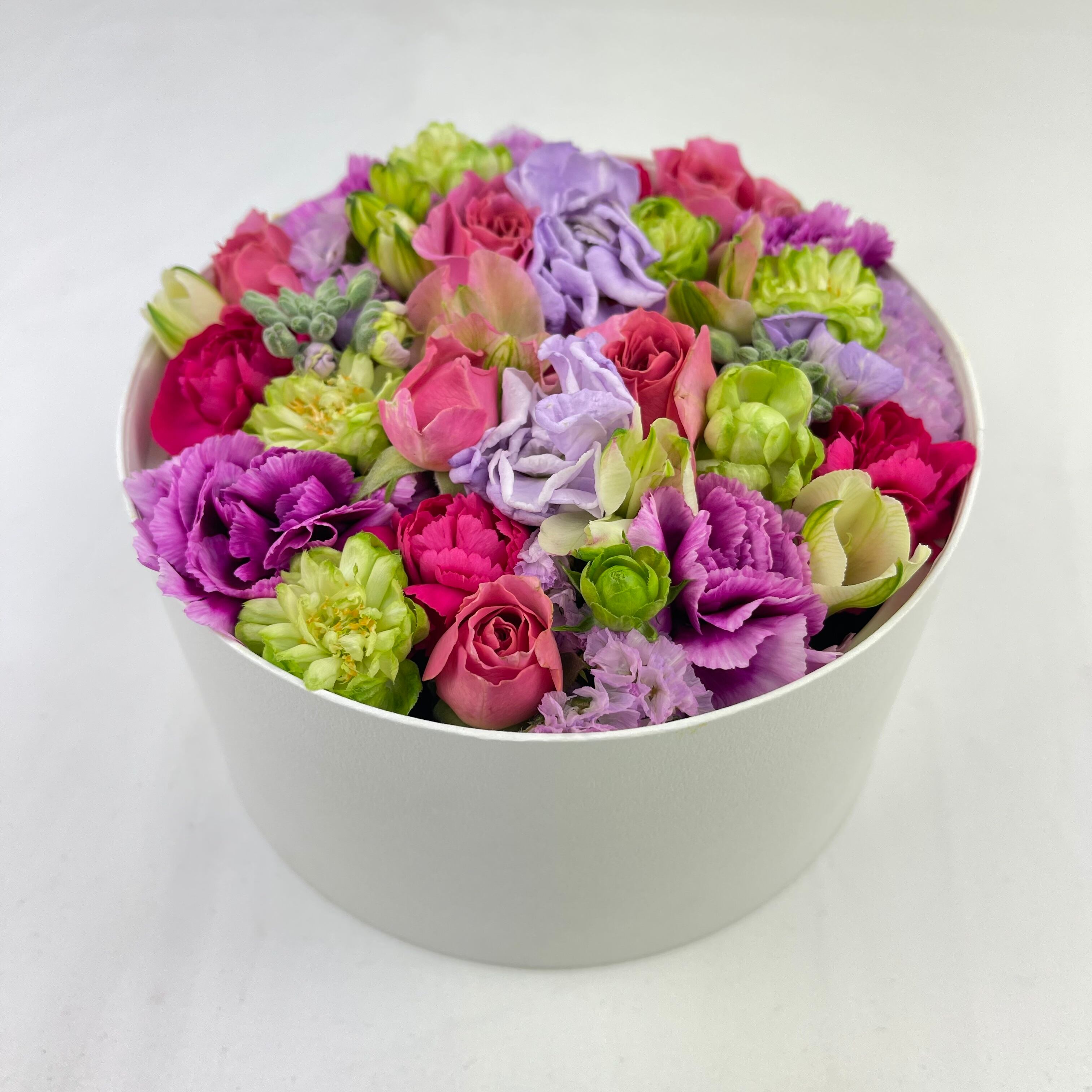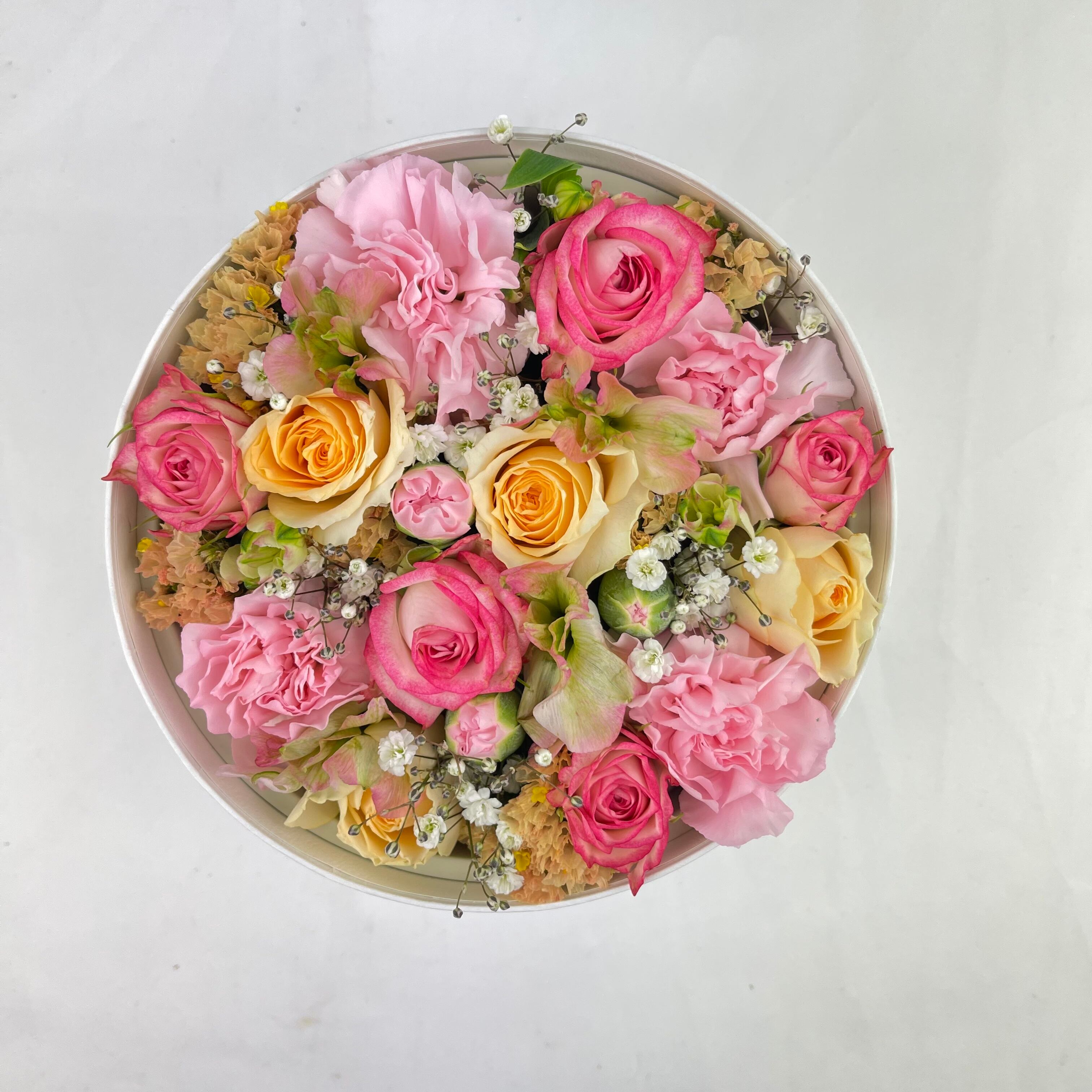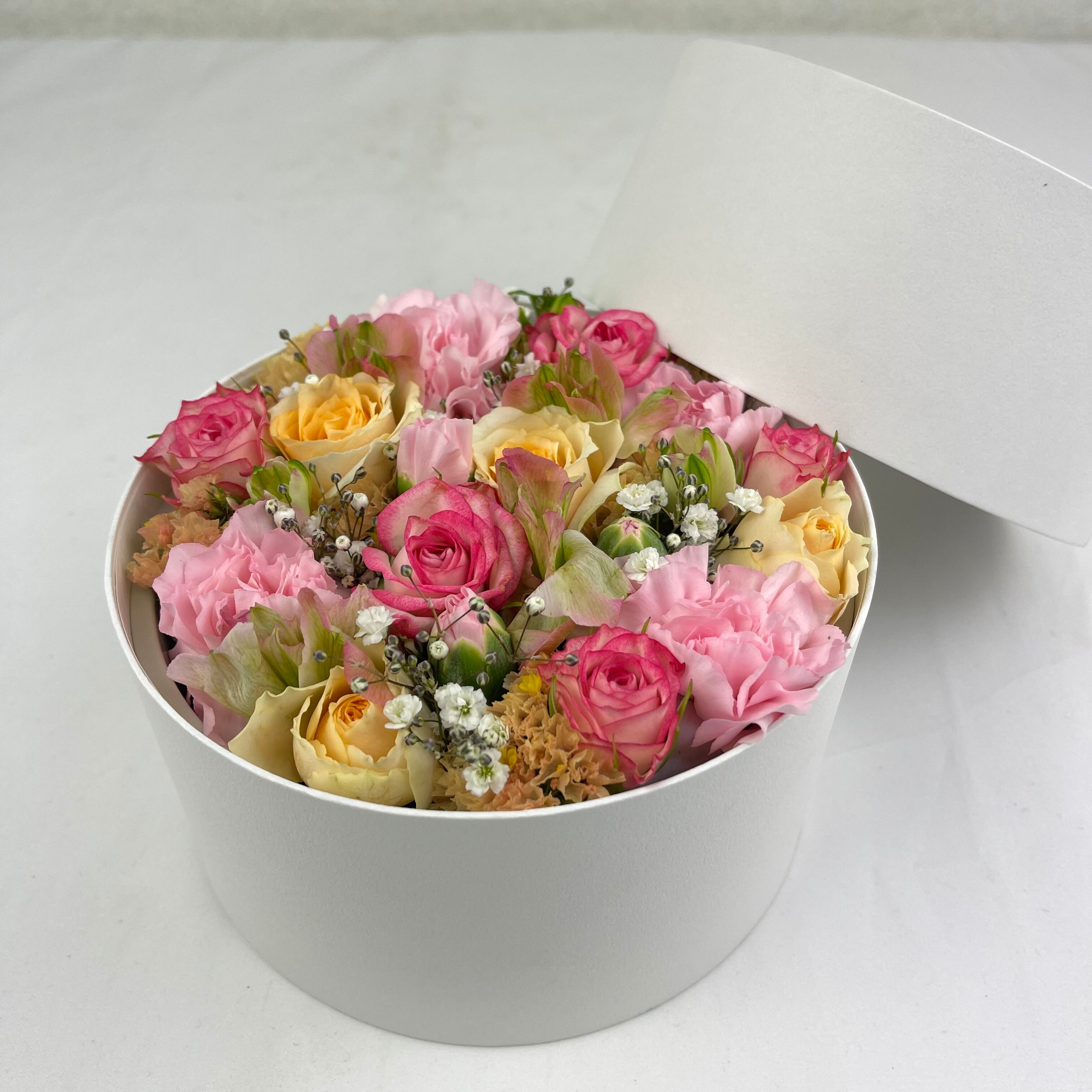 カーネーションを中心にバラやいろんなお花をミックスして丸いボックスにお花を詰め込みました。