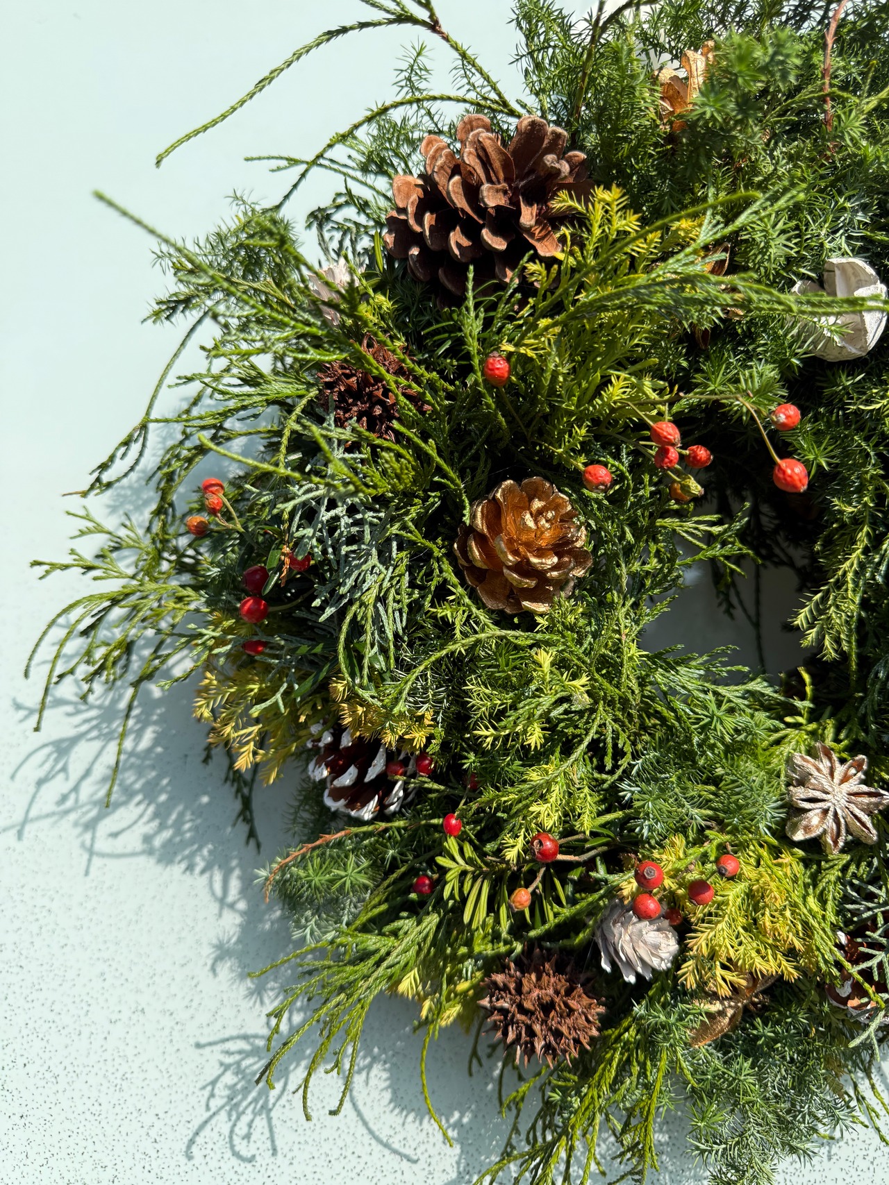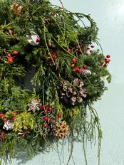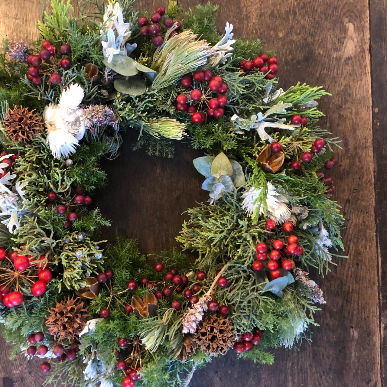 はなき自社農園のコニファーをふんだんに使ったXmasリース。今回は自社の生コニファーの良さを広めたい想いで、ボリュームにつりあわないくらいお得感のある仕上がりになっています♪