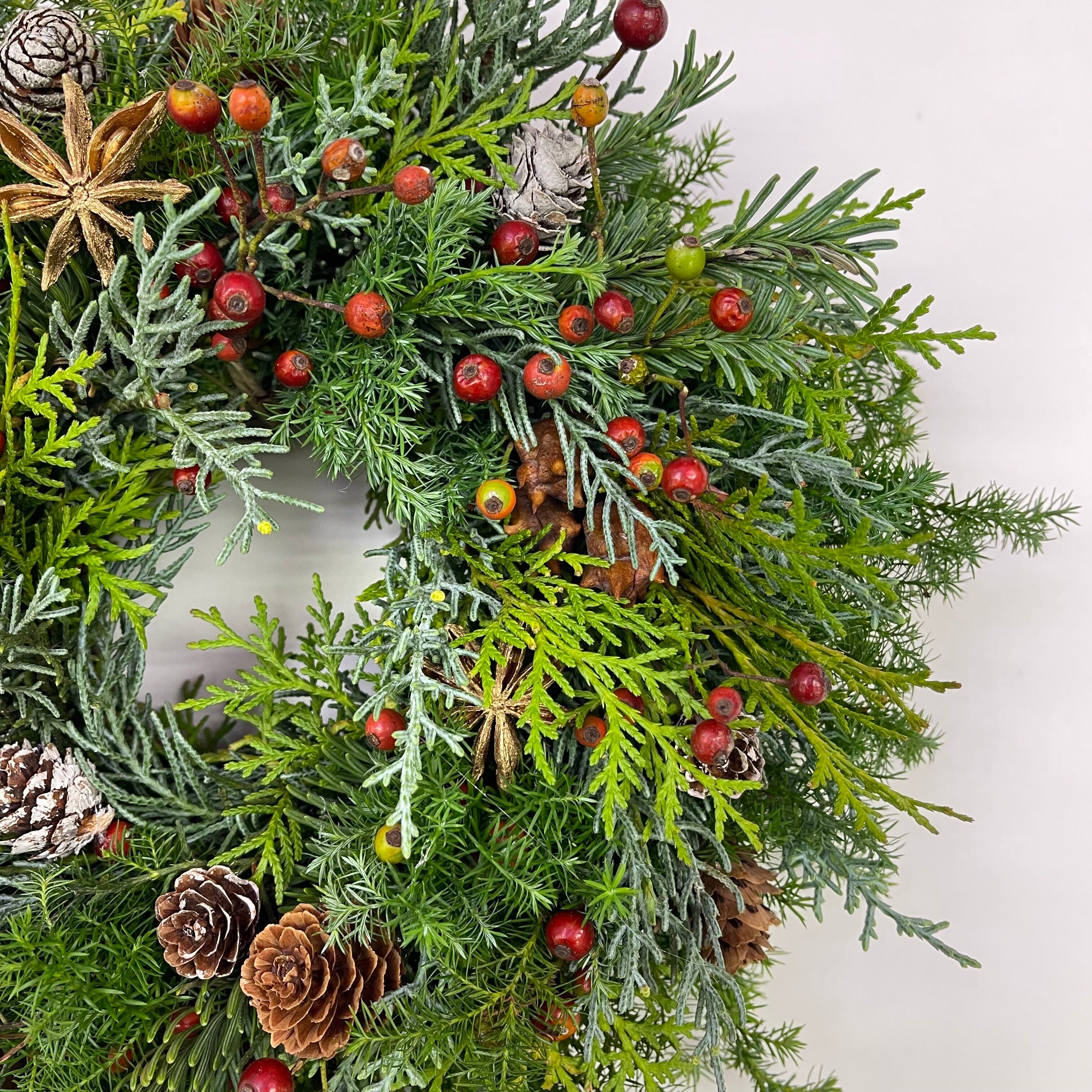 はなき自社農園のコニファーをふんだんに使ったXmasリース。今回は自社の生コニファーの良さを広めたい想いで、ボリュームにつりあわないくらいお得感のある仕上がりになっています♪